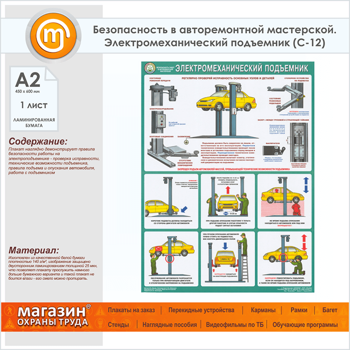 Плакат «Безопасность в авторемонтной мастерской. Электромеханический подъемник» (С-12, ламинированная бумага, А2, 1 лист) в Ижевске купить
