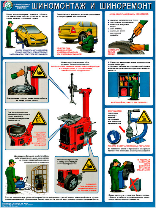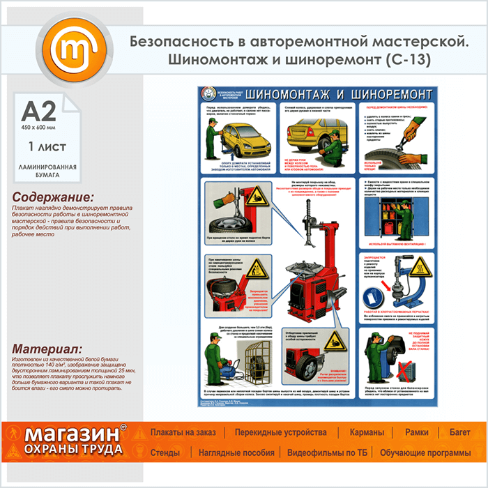 Плакат «Безопасность в авторемонтной мастерской. Шиномонтаж и шиноремонт» (С-13, ламинированная бумага, А2, 1 лист) в Ижевске купить