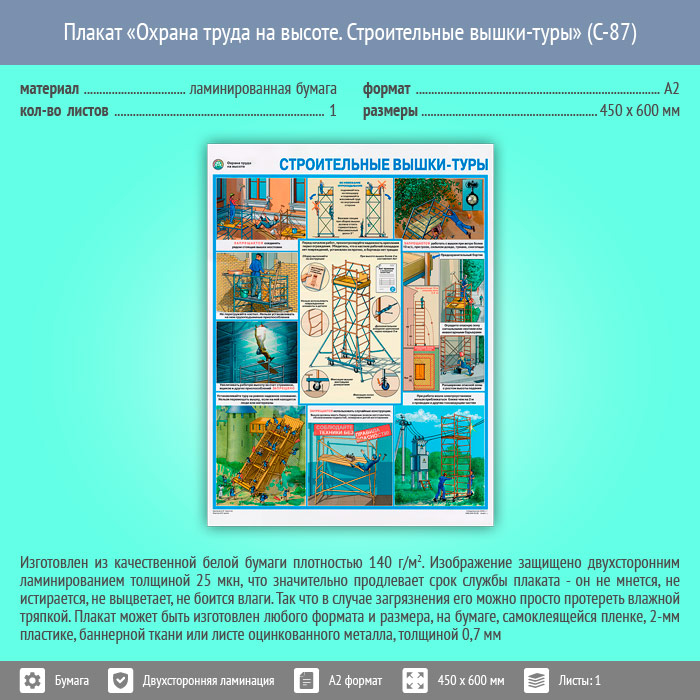 Плакат «Охрана труда на высоте. Строительные вышки-туры» (С-87, ламинированная бумага, А2, 1 лист) в Ижевске купить
