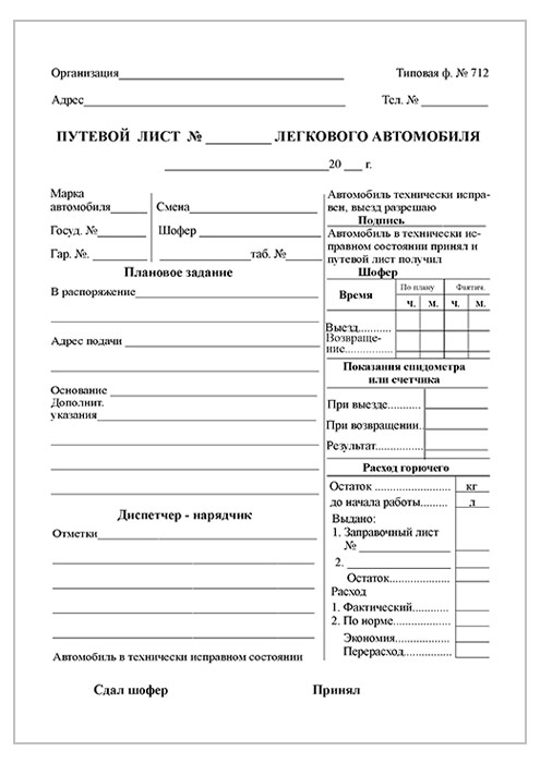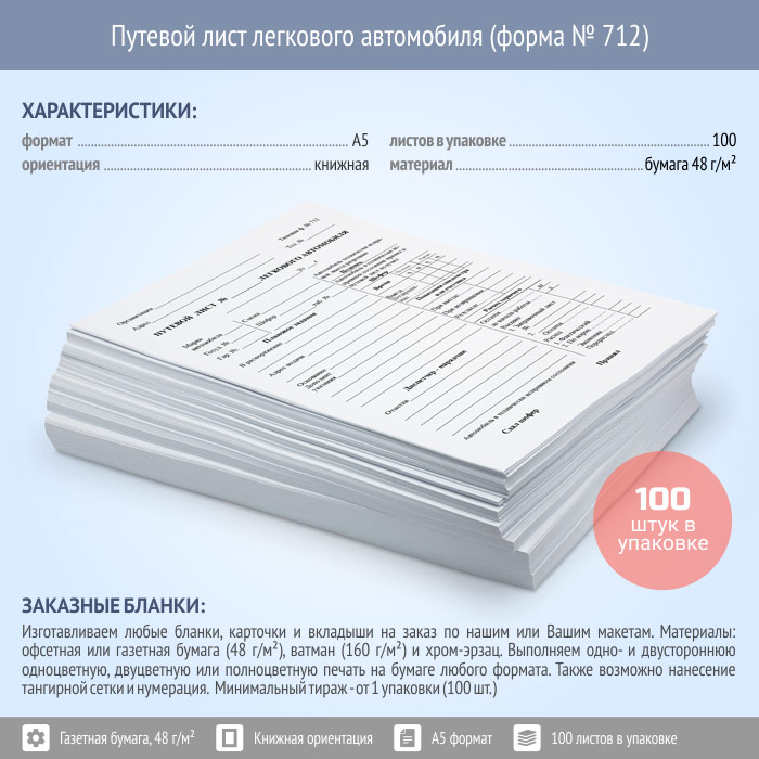 Путевой лист легкового автомобиля (форма № 712, упаковка из 100 штук) в Ижевске купить