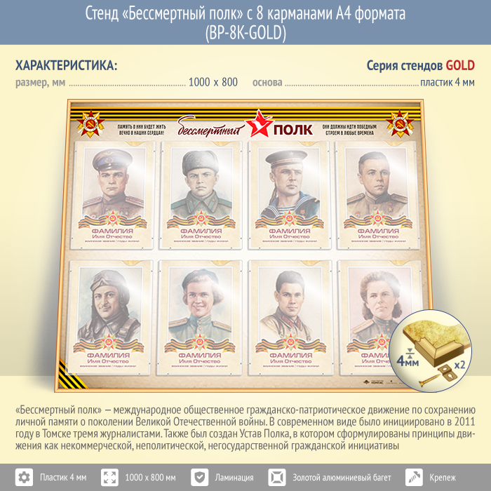 Стенд «Бессмертный полк» с 8 карманами А4 формата (BP-8K-GOLD) в Ижевске купить