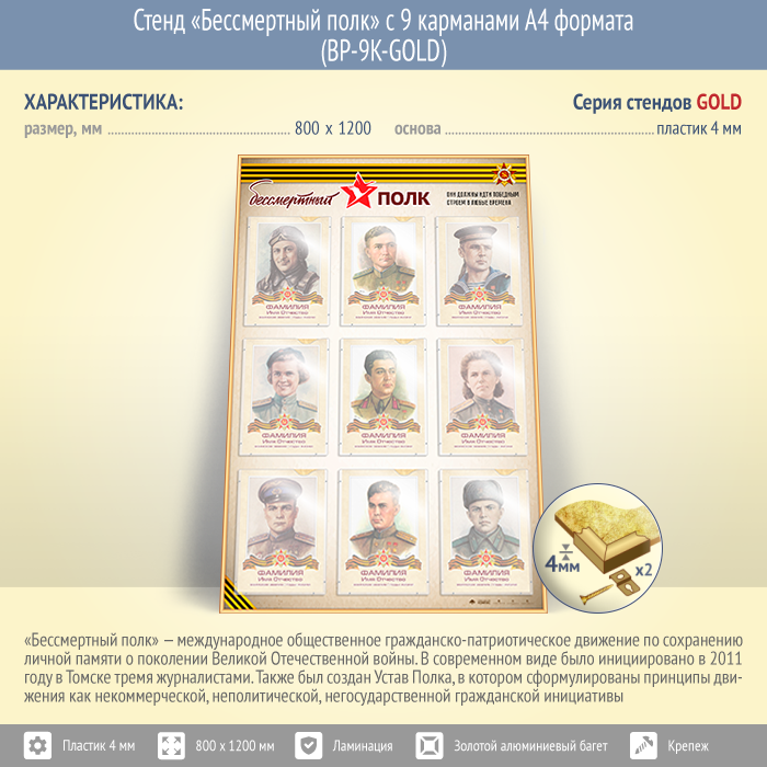 Стенд «Бессмертный полк» с 9 карманами А4 формата (BP-9K-GOLD) в Ижевске купить