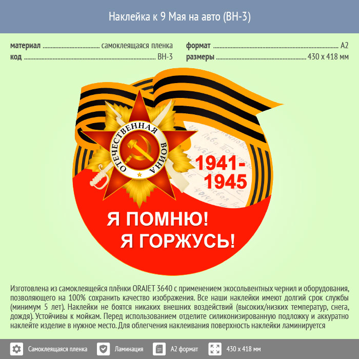 Наклейка к 9 Мая на авто А2 формата (BH-3) в Ижевске купить