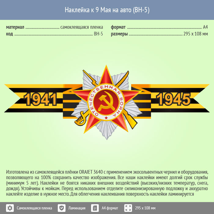 Наклейка к 9 Мая на авто А4 формата (BH-5) в Ижевске купить