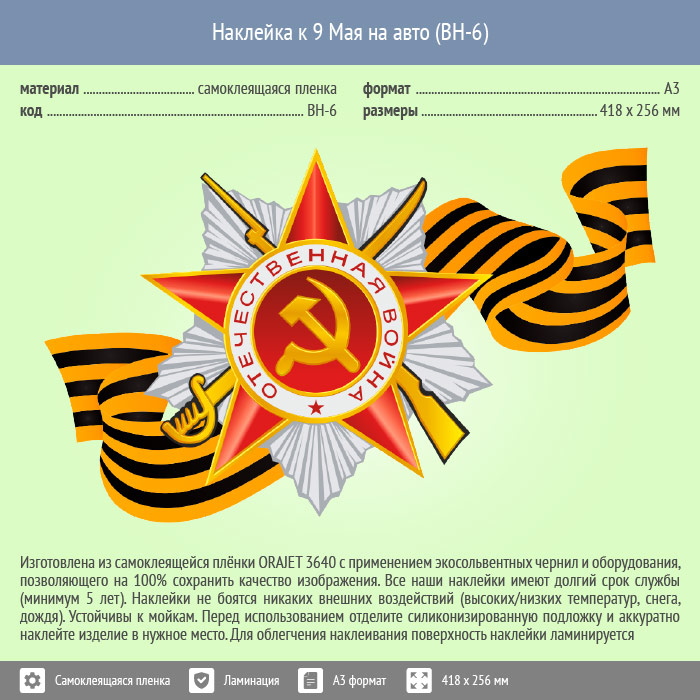 Наклейка к 9 Мая на авто А3 формата (BH-6) в Ижевске купить