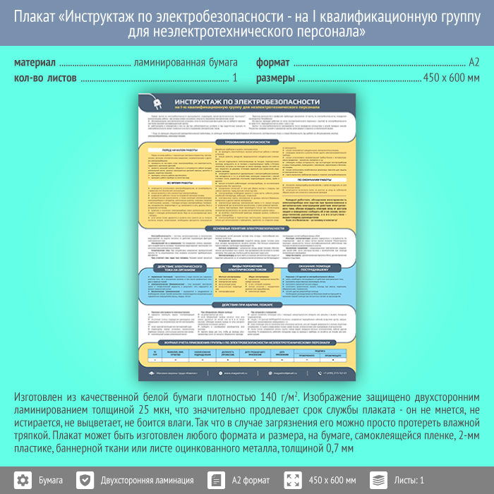Плакат «Инструктаж по электробезопасности - на I квалификационную группу для неэлектротехнического персонала» (М-71, ламинированная бумага, А2, 1 лист) в Ижевске купить