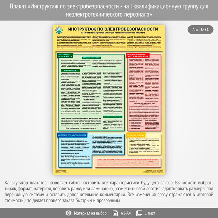 Плакат «Инструктаж по электробезопасности - на I квалификационную группу для неэлектротехнического персонала» (С-71, 1 лист) в Ижевске купить