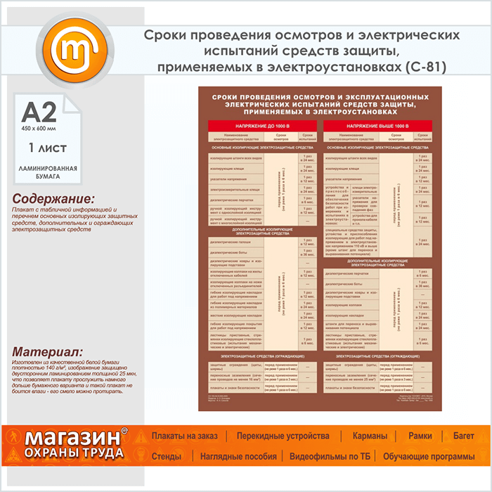 Плакат «Сроки проведения осмотров и электрических испытаний средств защиты, применяемых в электроустановках» (С-81, ламинированная бумага, А2, 1 лист) в Ижевске купить