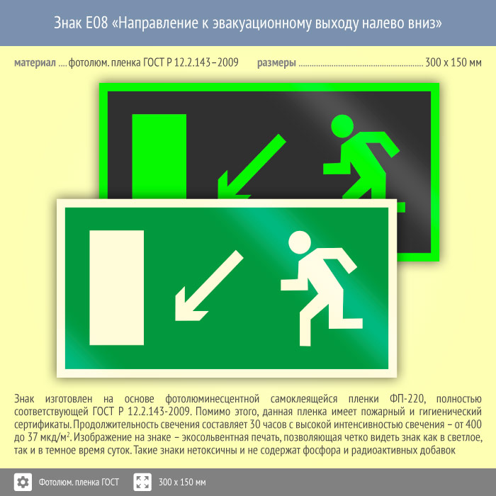 Знак E08 «Направление к эвакуационному выходу налево вниз» (фотолюминесцентная пленка ГОСТ 34428-2018, 300х150 мм) в Ижевске купить