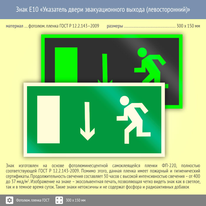Знак E10 «Указатель двери эвакуационного выхода (левосторонний)» (фотолюминесцентная пленка ГОСТ 34428-2018, 300х150 мм) в Ижевске купить
