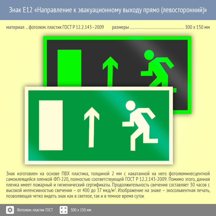 Знак E12 «Направление к эвакуационному выходу прямо (левосторонний)» (фотолюминесцентный пластик ГОСТ 34428-2018, 300х150 мм) в Ижевске купить