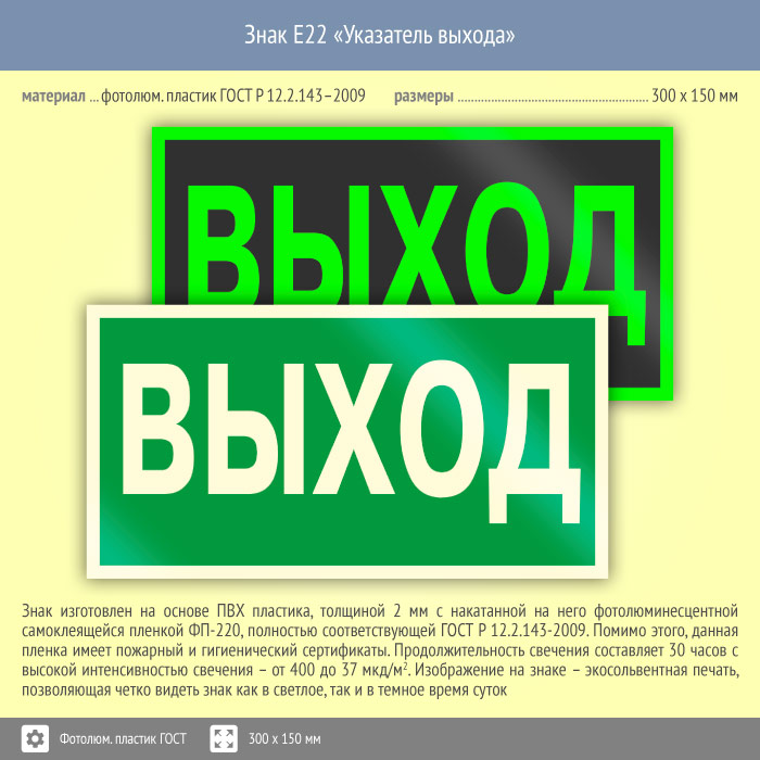 Знак E22 «Указатель выхода» (фотолюминесцентный пластик ГОСТ 34428-2018, 300х150 мм) в Ижевске купить