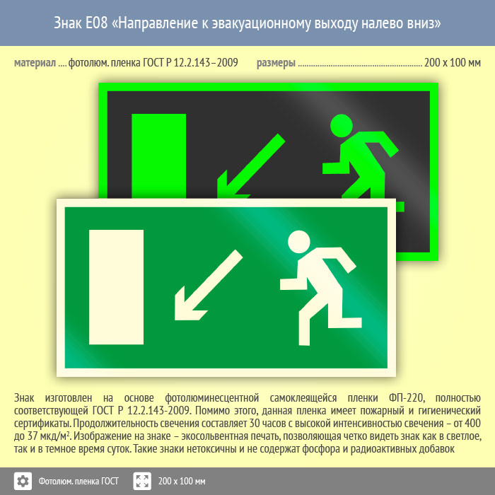 Знак E08 «Направление к эвакуационному выходу налево вниз» (фотолюминесцентная пленка ГОСТ 34428-2018, 200х100 мм) в Ижевске купить