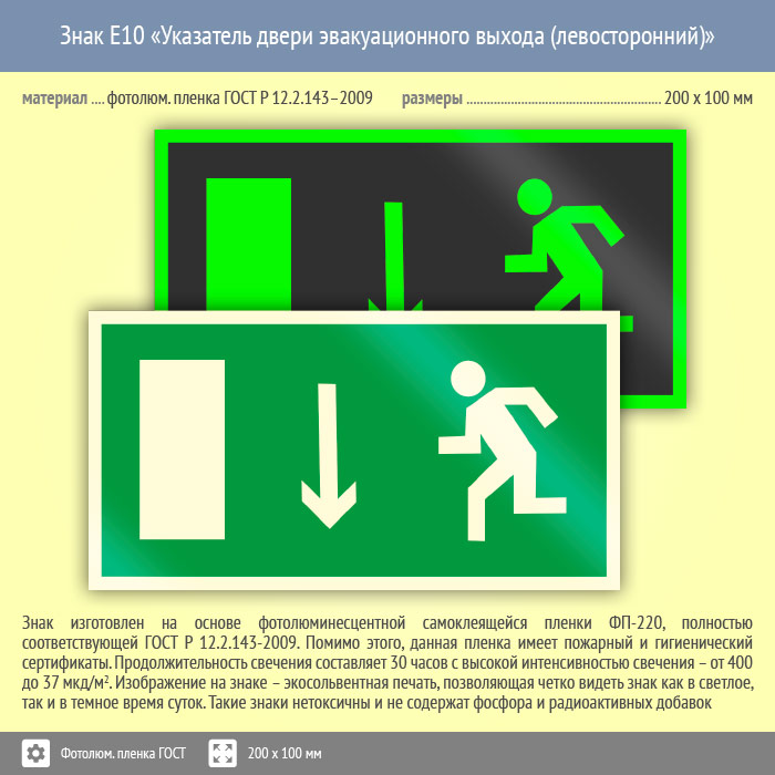 Знак E10 «Указатель двери эвакуационного выхода (левосторонний)» (фотолюминесцентная пленка ГОСТ 34428-2018, 200х100 мм) в Ижевске купить