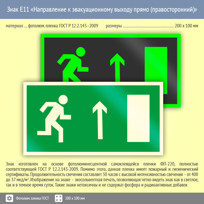 Знак E11 «Направление к эвакуационному выходу прямо (правосторонний)» (фотолюминесцентная пленка ГОСТ 34428-2018, 200х100 мм) в Ижевске купить
