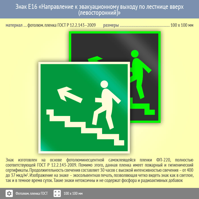 Знак E16 «Направление к эвакуационному выходу по лестнице вверх (левосторонний)» (фотолюминесцентная пленка ГОСТ 34428-2018, 100х100 мм) в Ижевске купить