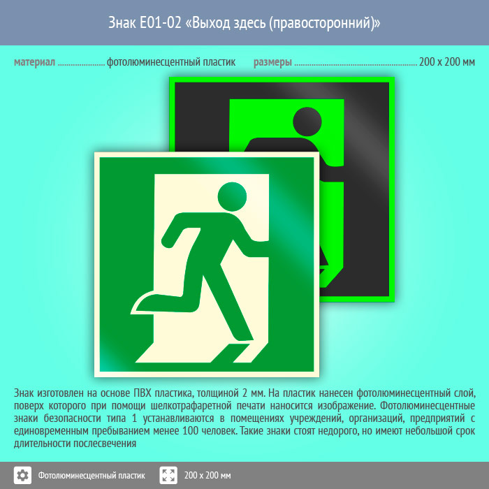Знак E01-02 «Выход здесь (правосторонний)» (фотолюминесцентный пластик, 200х200 мм) в Ижевске купить