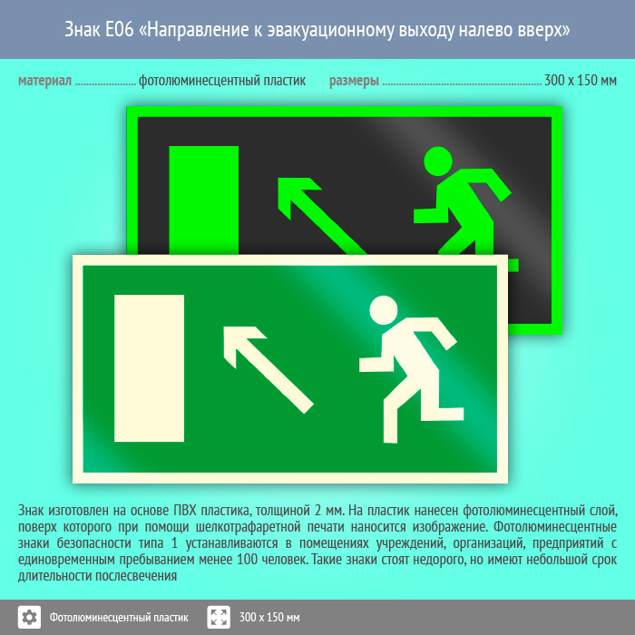 Знак E06 «Направление к эвакуационному выходу налево вверх» (фотолюминесцентный пластик, 300х150 мм) в Ижевске купить
