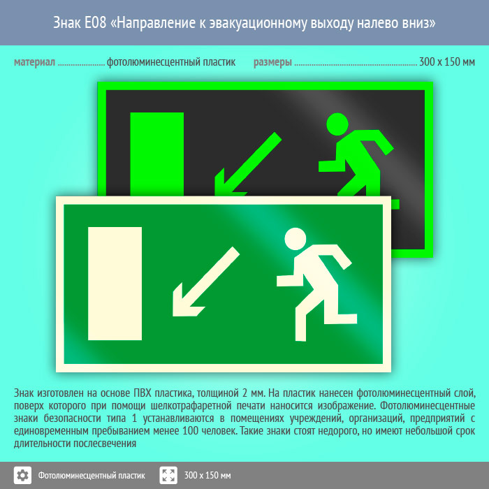 Знак E08 «Направление к эвакуационному выходу налево вниз» (фотолюминесцентный пластик, 300х150 мм) в Ижевске купить