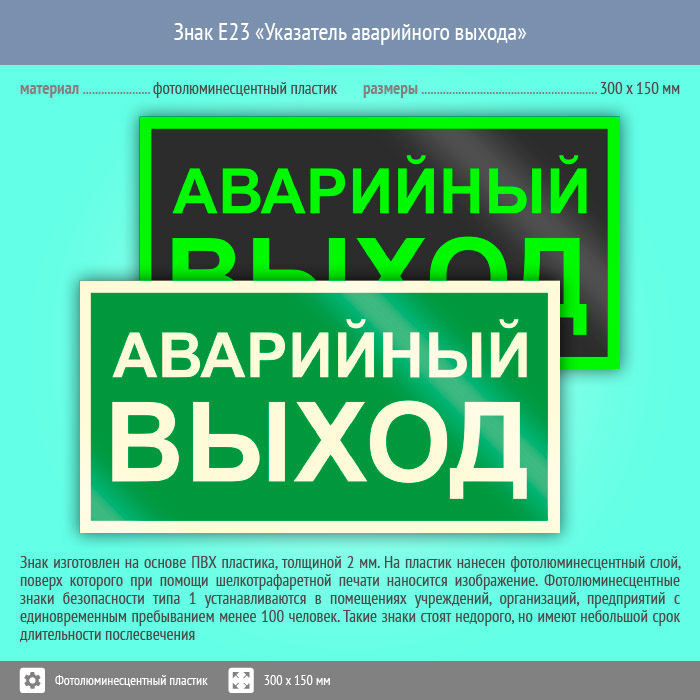 Знак E23 «Указатель аварийного выхода» (фотолюминесцентный пластик, 300х150 мм) в Ижевске купить