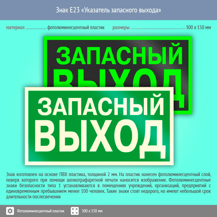 Знак E23 «Указатель запасного выхода» (устаревший) (фотолюминесцентный пластик, 300х150 мм) в Ижевске купить