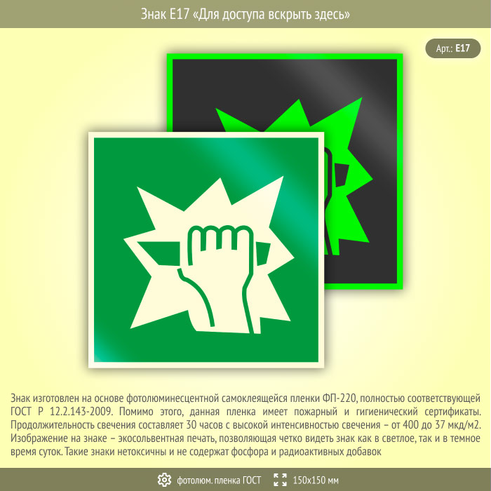 Знак E17 «Для доступа вскрыть здесь» (фотолюминесцентная пленка ГОСТ 34428-2018, 150х150 мм) в Ижевске купить