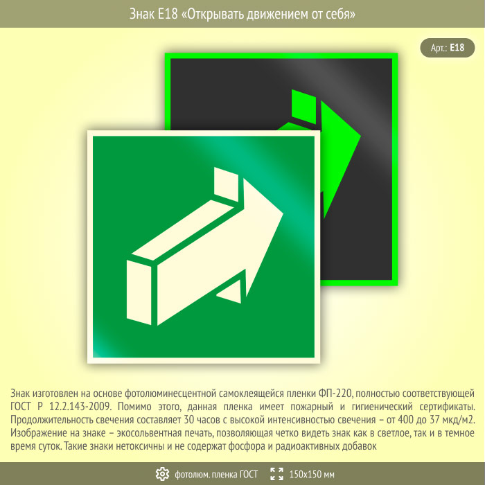 Знак E18 «Открывать движением от себя» (фотолюминесцентная пленка ГОСТ 34428-2018, 150х150 мм) в Ижевске купить