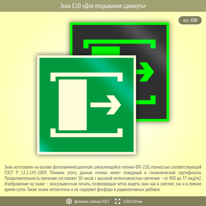 Знак E20 «Для открывания сдвинуть» (фотолюминесцентная пленка ГОСТ 34428-2018, 150х150 мм) в Ижевске купить