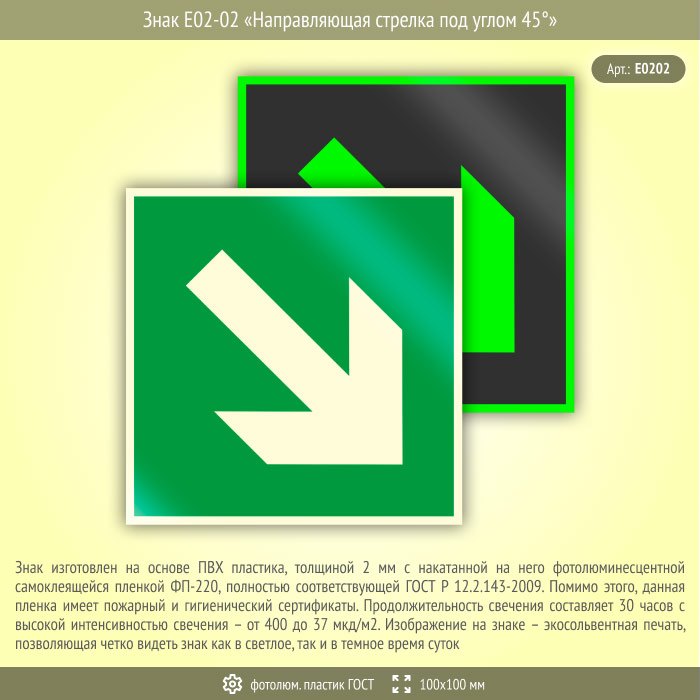 Знак E02-02 «Направляющая стрелка под углом 45°» (фотолюминесцентный пластик ГОСТ 34428-2018, 100х100 мм) в Ижевске купить