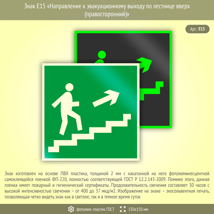 Знак E15 «Направление к эвакуационному выходу по лестнице вверх (правосторонний)» (фотолюминесцентный пластик ГОСТ 34428-2018, 150х150 мм) в Ижевске купить