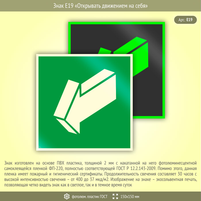 Знак E19 «Открывать движением на себя» (фотолюминесцентный пластик ГОСТ 34428-2018, 150х150 мм) в Ижевске купить