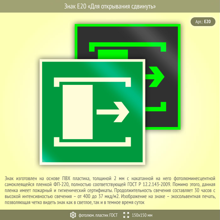 Знак E20 «Для открывания сдвинуть» (фотолюминесцентный пластик ГОСТ 34428-2018, 150х150 мм) в Ижевске купить
