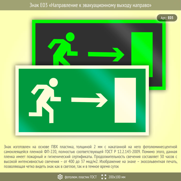 Знак E03 «Направление к эвакуационному выходу направо» (фотолюминесцентный пластик ГОСТ 34428-2018, 200х100 мм) в Ижевске купить