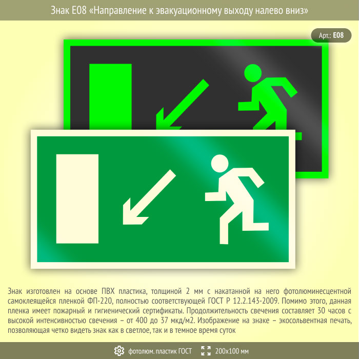 Знак E08 «Направление к эвакуационному выходу налево вниз» (фотолюминесцентный пластик ГОСТ 34428-2018, 200х100 мм) в Ижевске купить