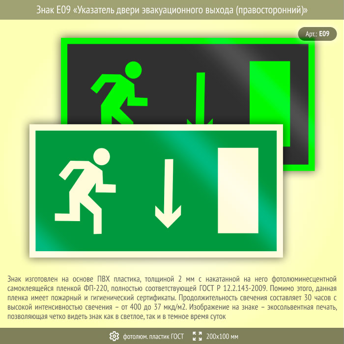 Знак E09 «Указатель двери эвакуационного выхода (правосторонний)» (фотолюминесцентный пластик ГОСТ 34428-2018, 200х100 мм) в Ижевске купить