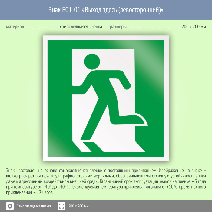 Знак E01-01 «Выход здесь (левосторонний)» (пленка, 200х200 мм) в Ижевске купить