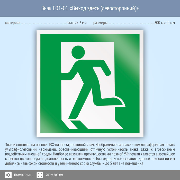 Знак E01-01 «Выход здесь (левосторонний)» (пластик, 200х200 мм) в Ижевске купить