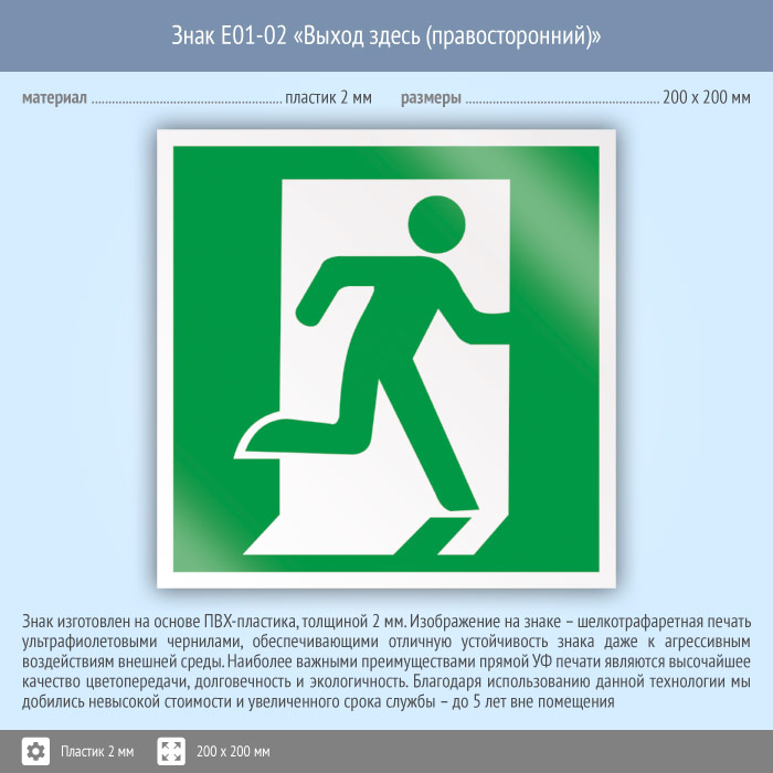 Знак E01-02 «Выход здесь (правосторонний)» (пластик, 200х200 мм) в Ижевске купить