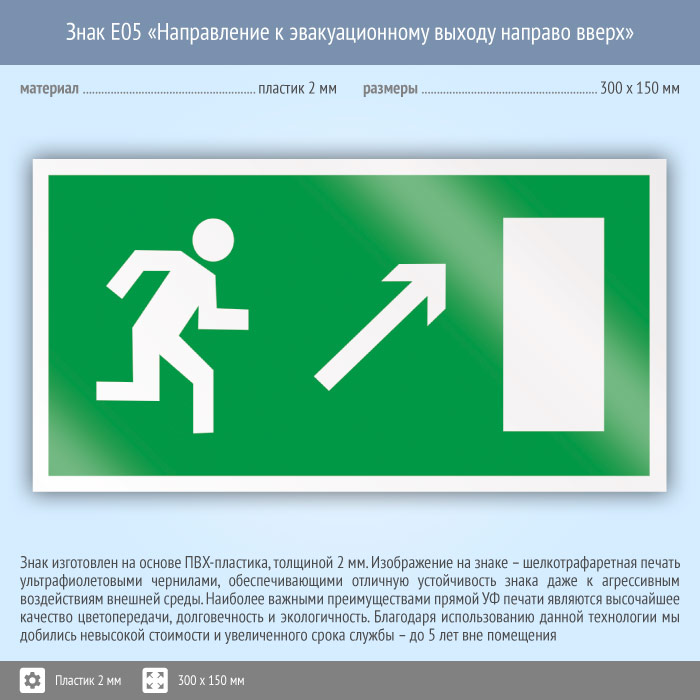Знак E05 «Направление к эвакуационному выходу направо вверх» (пластик, 300х150 мм) в Ижевске купить