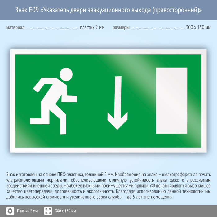 Знак E09 «Указатель двери эвакуационного выхода (правосторонний)» (пластик, 300х150 мм) в Ижевске купить