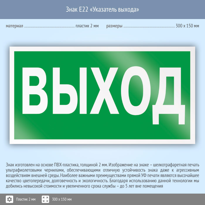 Знак E22 «Указатель выхода» (пластик, 300х150 мм) в Ижевске купить