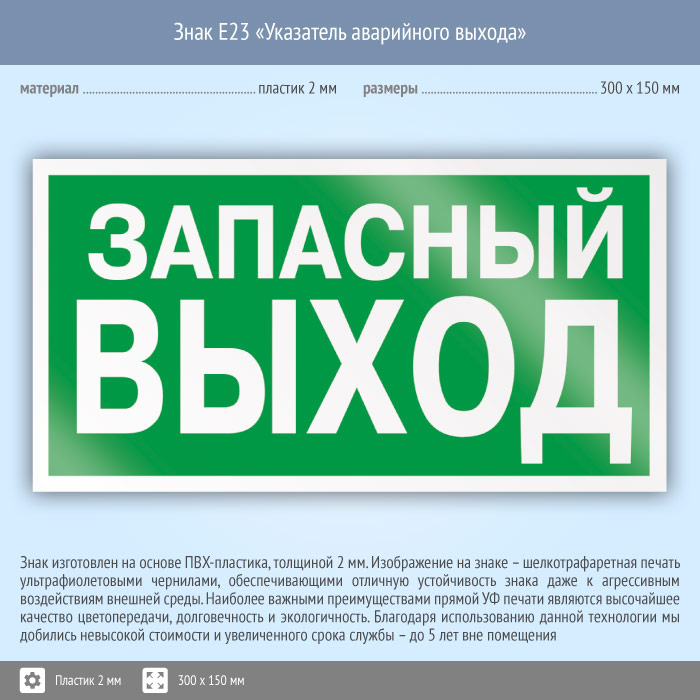 Знак E23 «Указатель запасного выхода» (устаревший) (пластик, 300х150 мм) в Ижевске купить