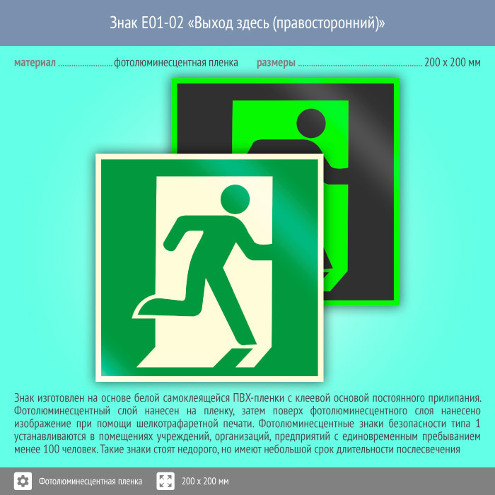 Знак E01-02 «Выход здесь (правосторонний)» (фотолюминесцентная пленка, 200х200 мм) в Ижевске купить