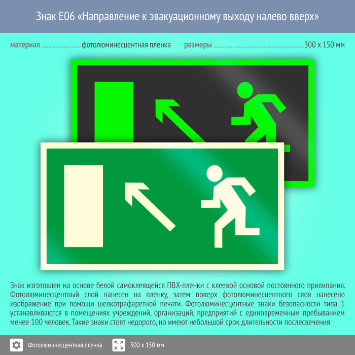 Знак E06 «Направление к эвакуационному выходу налево вверх» (фотолюминесцентная пленка, 300х150 мм) в Ижевске купить