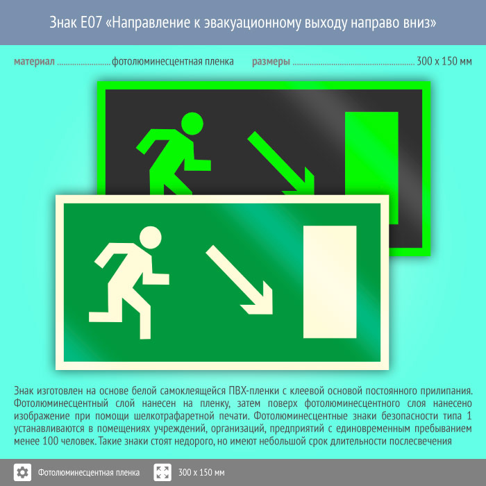 Знак E07 «Направление к эвакуационному выходу направо вниз» (фотолюминесцентная пленка, 300х150 мм) в Ижевске купить