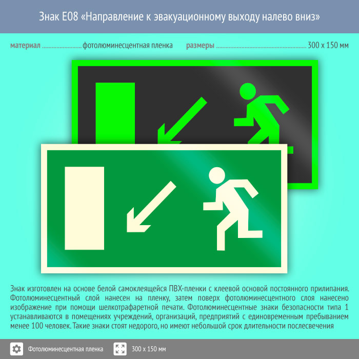 Знак E08 «Направление к эвакуационному выходу налево вниз» (фотолюминесцентная пленка, 300х150 мм) в Ижевске купить