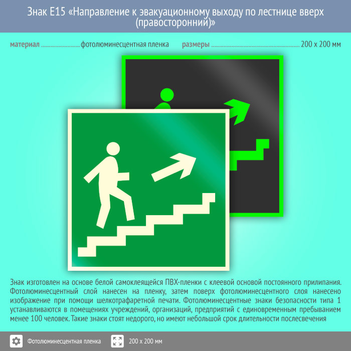 Знак E15 «Направление к эвакуационному выходу по лестнице вверх (правосторонний)» (фотолюминесцентная пленка, 200х200 мм) в Ижевске купить