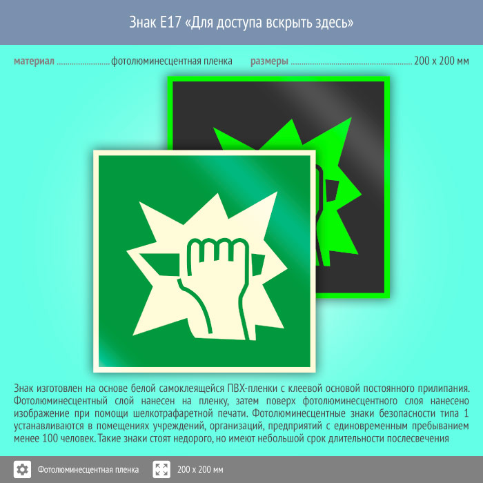 Знак E17 «Для доступа вскрыть здесь» (фотолюминесцентная пленка, 200х200 мм) в Ижевске купить