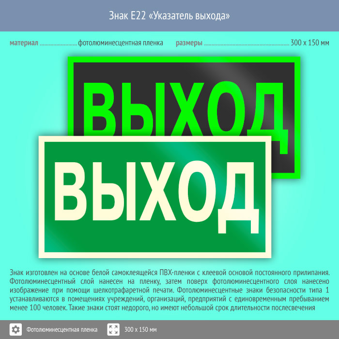 Знак E22 «Указатель выхода» (фотолюминесцентная пленка, 300х150 мм) в Ижевске купить