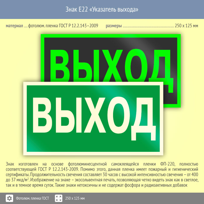 Знак E22 «Указатель выхода» (фотолюминесцентная пленка ГОСТ 34428-2018, 250х125 мм) в Ижевске купить